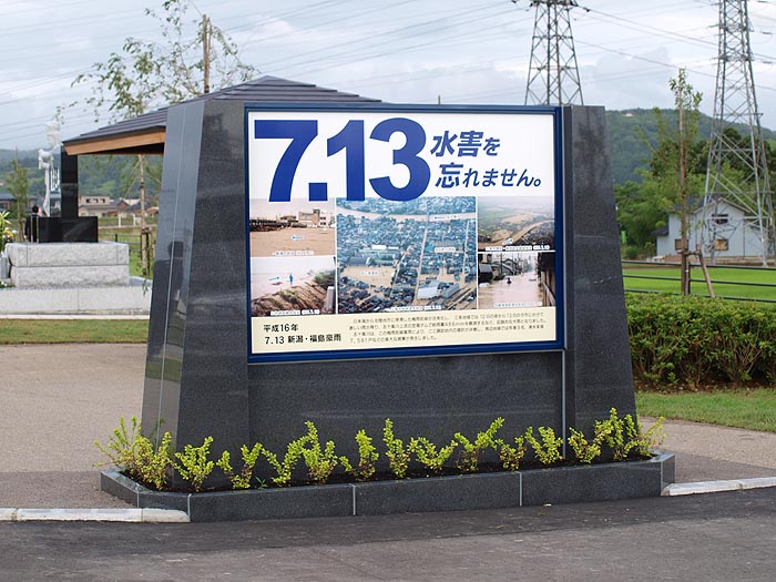 それと言うのも もっぱらの撮影場所である三条鍛冶道場で問題が・・・ 三条の伝統技術である 『和釘造り』 を体験する子供たちの写真が撮れなくなってしまったからだ。 昨年までは 取材後 学校や市の教育委員会に確認を取りHPで公開してきた。 いままでは支障なくUPできてきたが 今年に入り急に撮影を拒否されるようになった。 子供たちのプライバシーを重んじる為と理解はできるのだが 伝統技術に挑戦する子供たちの姿に魅せられ撮り続けてきた自分としては 何か意欲が無くなってしまった。 この秋には 子供たちが体験した『和釘造り』 その和釘を使って 『御守』 を作る構想を練っている。 三条鍛冶道場で触れた伝統技術 それを活かした地域活性化が出来ればと願っている。 そんなこんなはあったものの 月が変わった8月。 気分を変えて また撮り始めようと 久し振りに夕日を狙ってきた。 雲が無く 劇的な写真は撮れなかったものの 明日への希望が沸いて来る爽やかな空が撮れた。 平成16年7月13日午後1時15分、数日前から降り続いた雨による増水で、五十嵐川の堤防が限界を超え三条市諏訪地内が破堤、一気に嵐南地域を濁流が飲み込み、未曾有の災害をもたらした。 人々の生活や財産などあらゆる物を飲み込んだこの水害は、9人もの尊い命も奪い去り、大きな爪跡を残しており、いまなお市民の傷は癒えていない。 今思えば被災当時、人々はただただ復旧に追われる毎日で、命を落とされた方々への哀悼の意を唱える余裕すら無かったと思う。 当時、水害の被害が少なかった嵐北地域に住む私達は被災者への生活支援に奔放したものの、まだ心に余裕があった。 支援をしている中で、水害で犠牲になられた方々の無念を一日も早く晴らしてやりたいという気持ちが自然に湧き起こり慰霊碑建立運動を決意した。 亡くなられた方々には怨念の川であろう五十嵐川も、私にとっては恩恵を受ける川であり、秋になると川を遡上する鮭を使った出汁でラーメン作って販売、毎年の販売開始日にチャリティーラーメンを行い、その時々に起こった災害の義援に充てて来た。 この年は、水害の打撃ですっかり川も荒れ、復旧工事で濁り返った五十嵐川に鮭の遡上が危ぶまれたが、鮭は見事に母なる川に戻ってきた。 この鮭たちにも元気付けられ、この年からは水害犠牲者の慰霊碑建立という目標でチャリティーや義援募金活動を開始した。 当初は、大きな慰霊碑は無理なら、せめて小さなお地蔵様だけでもと願い、不安の気持ちの中でイベントを続けた。 しかし、そんなチャリティー活動の中で心強い応援の力をいただいた。 お地蔵様を造ると言ってもどんな手段があるのか。 模索する中、新聞で知った仏画の本庄基晃先生に失礼をかえりみず、お地蔵様の下絵を描いていただけないかと思い切ってお願いをしてみた。 突然訪ねた私に、先生は 『その時はいつでも言ってください無償で協力しますよ』 という温かい言葉をかけてくださり、挙句に 『仏画を差し上げるのでチャリティーに使ってください』 という思ってもみなかったお言葉もいただいた。 今思えば、あの時の本庄先生の温かい言葉が私の気持ちの支えになっていたと思う。 流石に、お言葉に甘えることは出来なかったが・・・・(笑) 一昨年、それまで私の活動を見続けていてくれたロータリークラブ会員の友人が私の非力を心配し『水害当時、全国のロータリークラブから寄せられた義援金の中で余裕があるらしいので災害時に会長を務めておられたマルソーの渡辺喜彦会長さんにお願いしてやるよ』と申し出てくれた。 正直、この先何年続けたら念願が叶うのかと心細かった私の気持ちが、もう完成したかのように晴れ晴れとしたのを覚えている。(笑) その年の7/13には、本成寺で犠牲者の法要を執り行い本格的に市や県を巻き込む計画がスタートした。 私は、この時点で自分の役割は終えたと思っていたが、渡辺会長さんからは災害メモリアルパーク予定地や記念碑の設計図面などが出来上がるたびに書類を届けていただき、渡辺会長さんの実行力と熱意、心配りにただただ感心するだけで、自分が始めた運動であることも忘れ慰霊碑の完成を心待ちにする一市民になっていた。 水害から5年目のこの日、決壊現場に完成した「水害復興記念公園」で執り行われた慰霊祭には災害で命を落とされた方のご遺族や県知事、地元選出の国会議員、国定市長や被災した地元の自治会長さんなどのほか多くの方々が参列。 5年前のあの日を思い起こさせる朝からの大荒れの天候も、慰霊祭の開始時刻に合わせるかのように雨も上がり、無事に慰霊祭を終えることができた。 この慰霊祭には私も参列させていただいたものの、あろうことか、最前列に自分の席が用意されているとは思っておらず、身に余る光栄に恐縮しっぱなしであった。 慰霊碑の除幕、献花の際には国定市長さんから『一緒に行きましょう』とお声がけをいただき、市長さんと並んで行ったことは