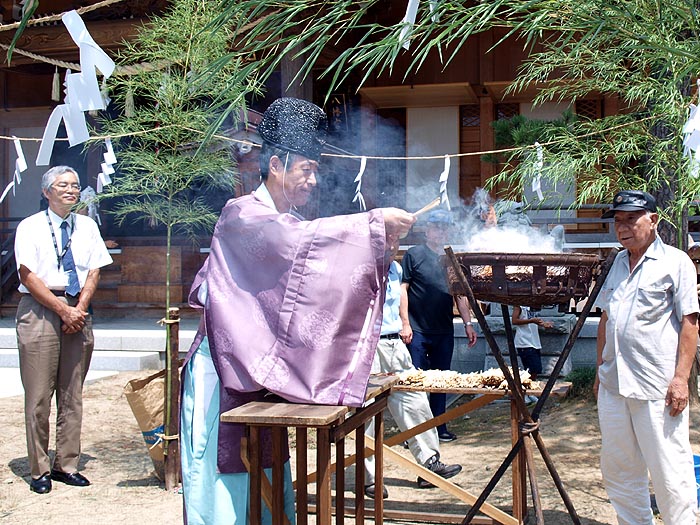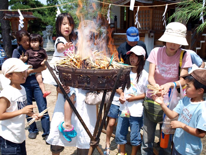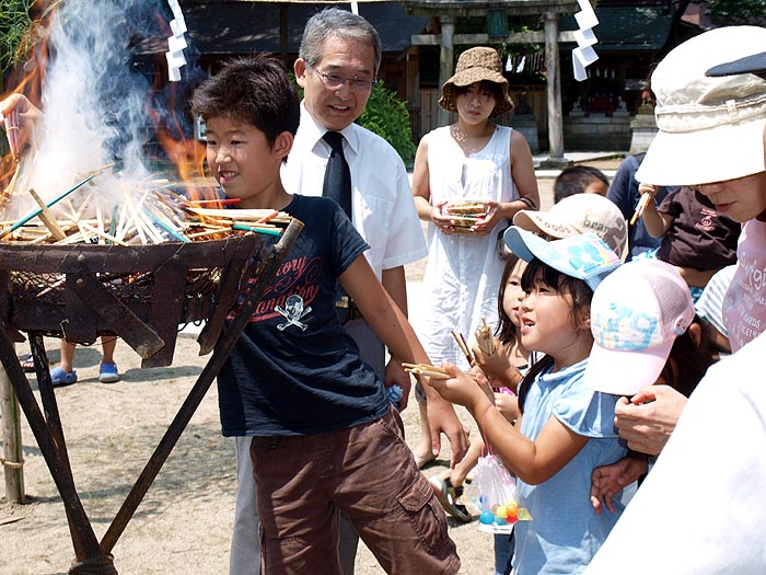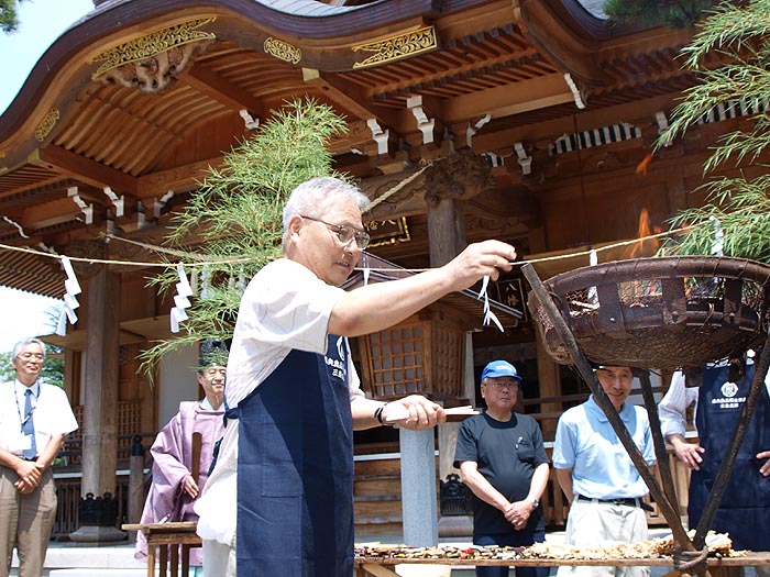この行事は 県央食品衛生協会三条支部が昭和53年から行っているもので 平成16年の水害の年に中止したものの 現在まで続けられている。 梅雨の上がりを思わせる真夏日のこの日 県央食品衛生協会三条支部(小栗忠夫支部長)に所属する各組合の会員が焼きそばやカキ氷を無料で提供したり 子供が楽しめる金魚の変わりにスマートボールをすくう『スマートボールすくい』も用意され 毎年夏休みのミニ縁日を心待ちにしている親子連れで賑わった。 午前10時から神事を執り行い 11時から縁日開始の予定が開始時間を待ちきれない子供たちで埋め尽くされた出店の前は賑やかな声で溢れ 予定の30分も前に開始し 用意された400食の焼きそば 350個のカキ氷は1時間で スマートボールすくいにいたっては30分で終了。 それでも 訪れた親子連れ全員にゆきわたり 担当する会員はほっと胸をなでおろしていた。 供養の箸焼納では焼きそばを食べ終えた子供たちが いただいた焼きそばへの感謝も込めて神事に参加。 熱い火を怖がりながらも箸を火にくべ 手を合わせていた。 ここしばらく書き込みが滞ってしまった。